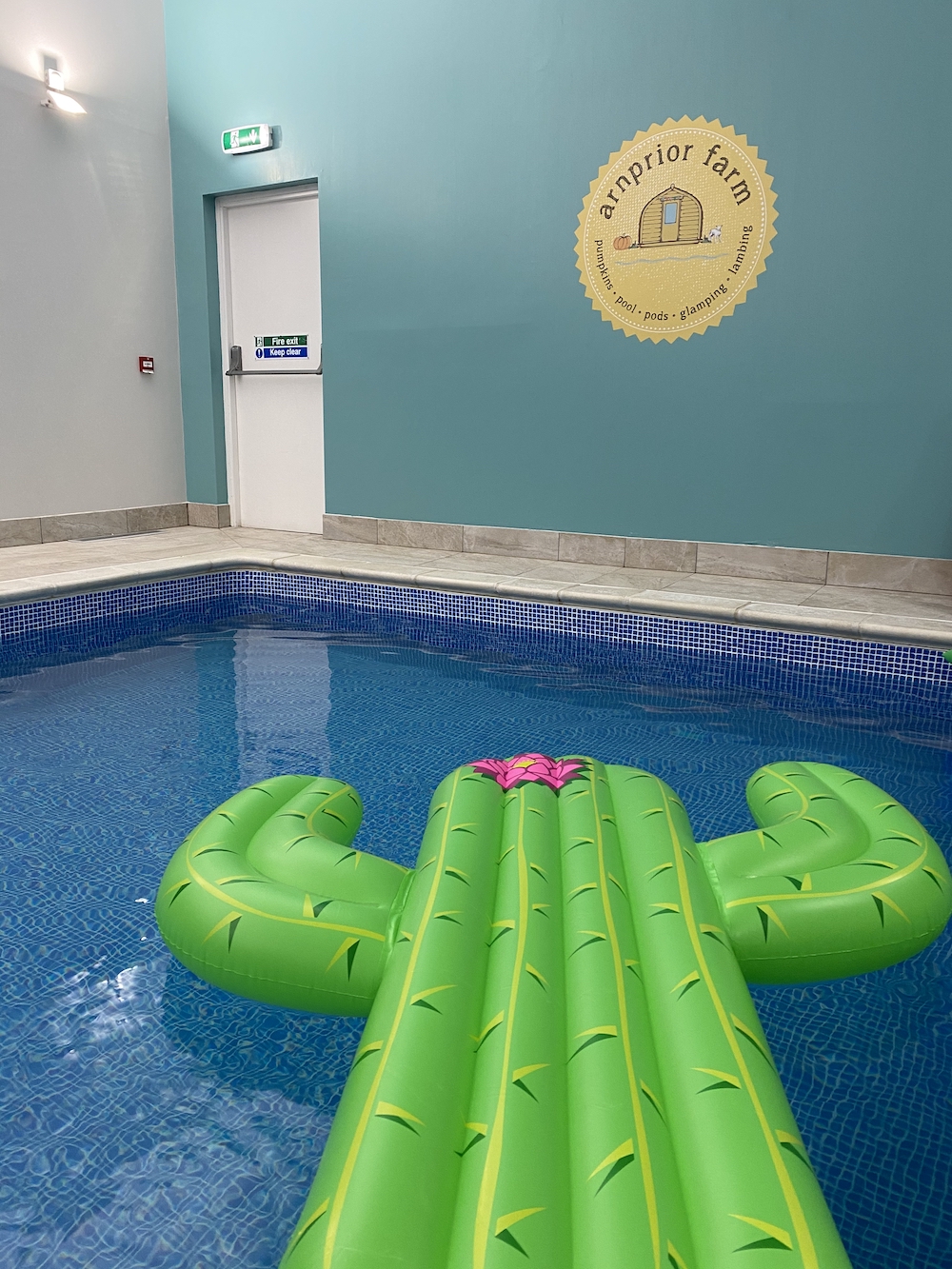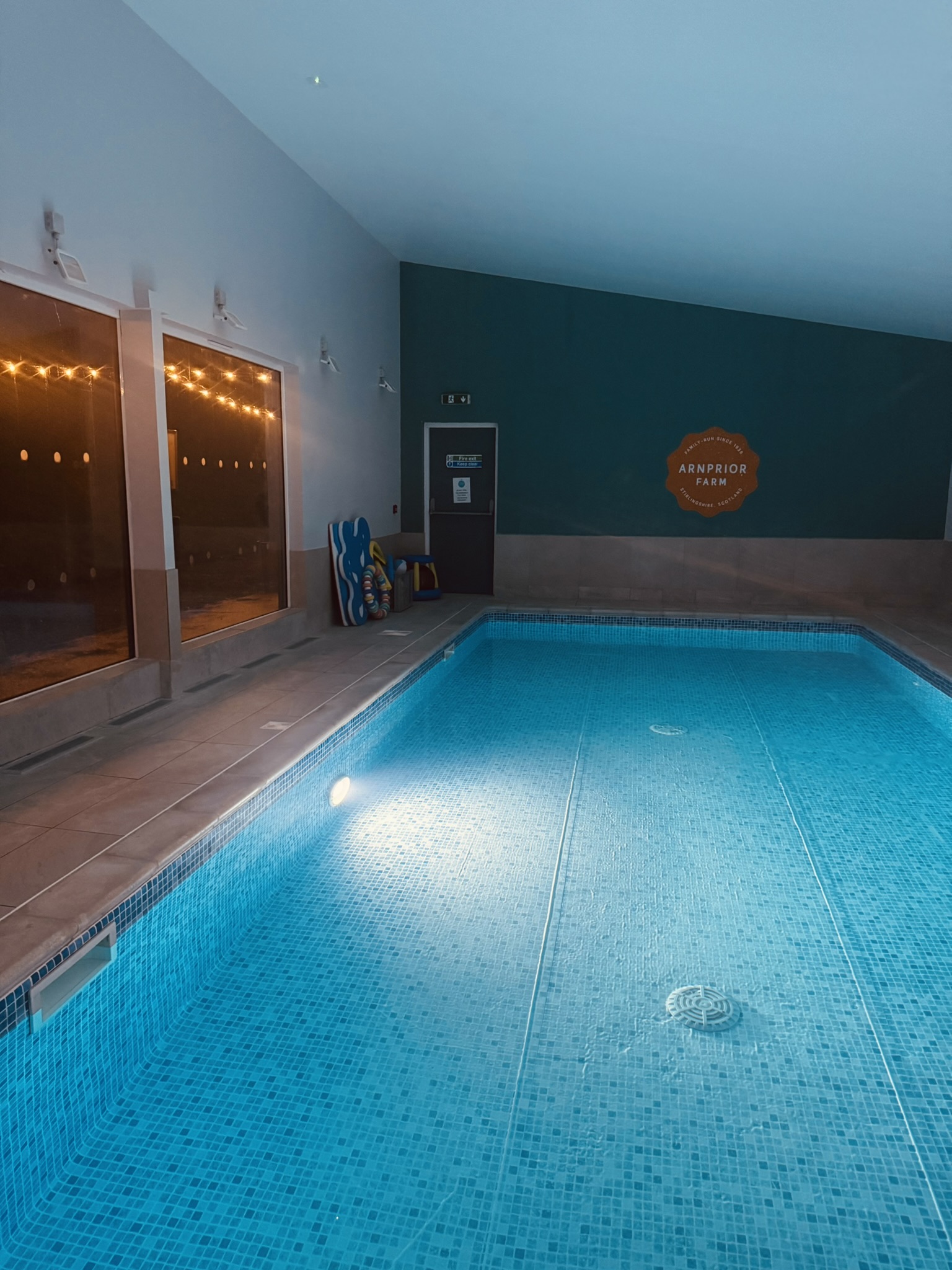 Our glamping pod site features a 10 x 4m private and heated indoor swimming pool with panoramic window overlooking our farm, it is the perfect spot for a luxury secluded swim. The swimming pool is open to everyone, from pod guests, to families in our community looking for a private place to swim. It is ideal for fun family swims, a kids swimming party or even private swim training. When you hire the pool, you have it completely to yourself!